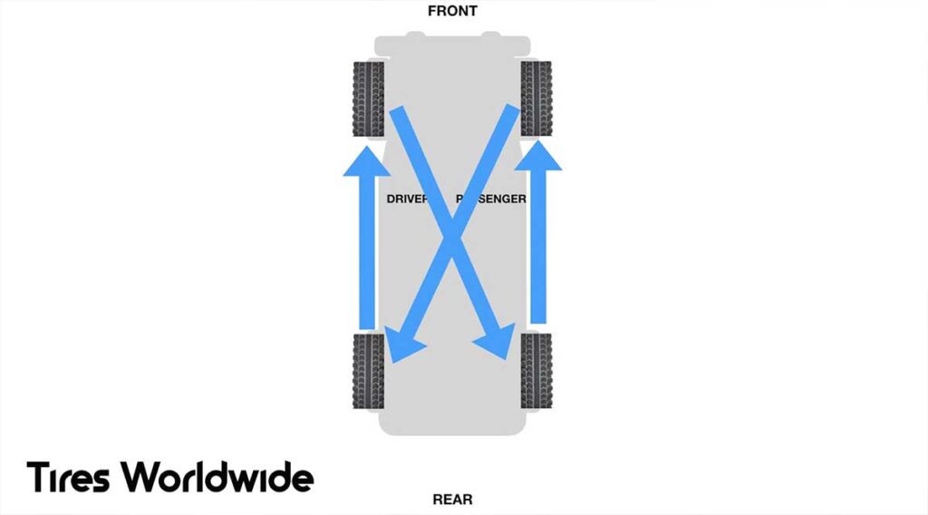 For these setups, the usual rotation is the rearward cross pattern. In this pattern, the back tires move straight to the front. The front tires move to the back but cross sides.