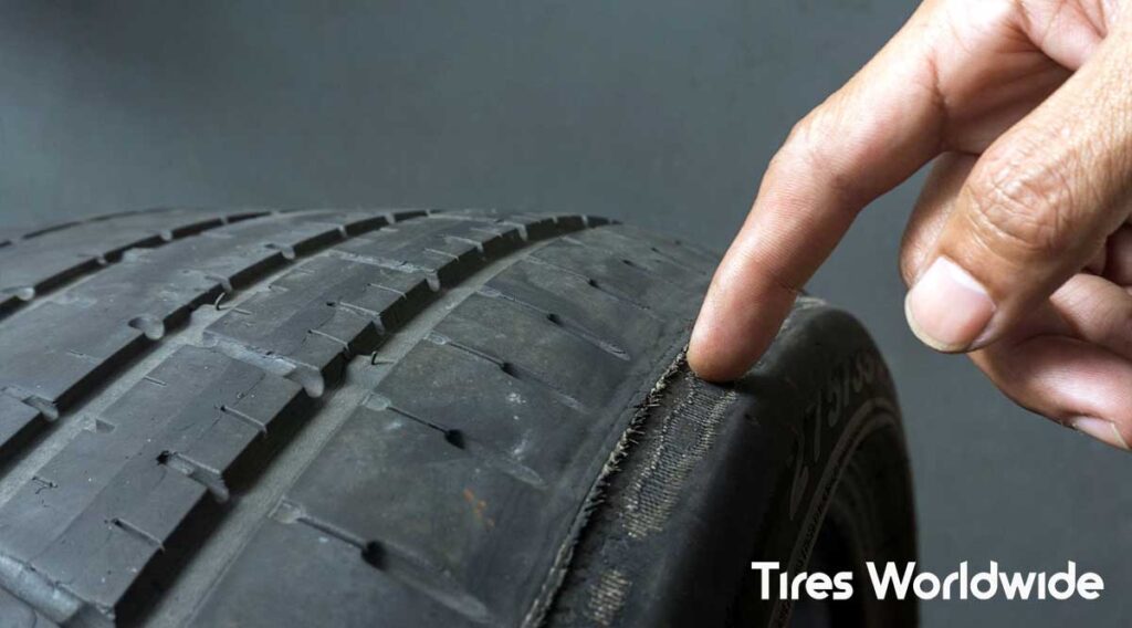 If your tire looks like it has little dips, waves, or scooped-out spots, that’s called cupping (or scalloping). This one usually surprises people because it looks so weird.