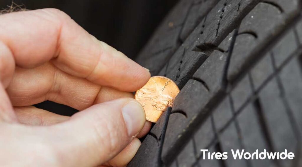 You can measure the tread using a small tool called a tread depth gauge. They’re cheap and easy to use. But if you don’t have one, the penny or quarter test works fine.