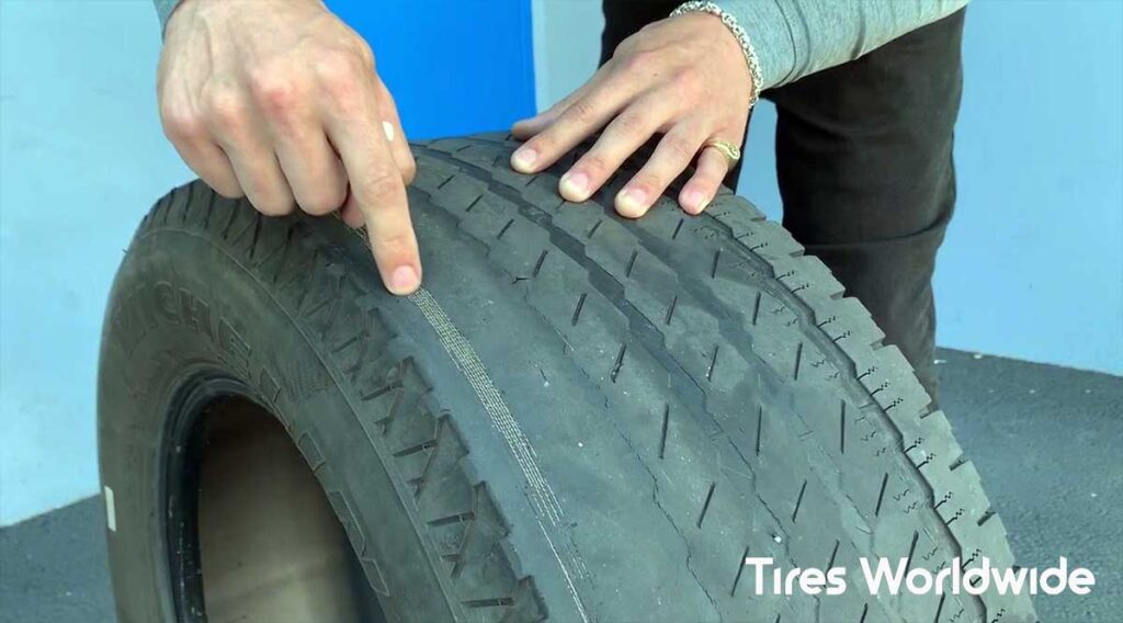 The sidewall is the smooth part of the tire on the outside. It should look clean and firm. If you notice cracks, lines, or tiny splits, that’s a sign the tire is drying out. This is often called “dry rot,” and it means the rubber is getting weak.
